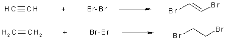 Алкины присоединяют галогены, галогеноводороды, воду и другие реагенты по электрофильному механизму, однако такие реакции протекают значительно труднее, чем в алкенах. В качестве причин можно привести следующие: