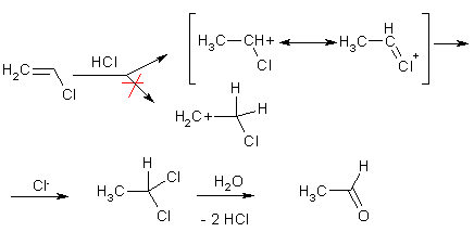 Дальнейшее присоединение хлороводорода к винилхлориду протекает легко и ориентируется в соответствием с правилом Марковникова – образуется 1,1-дихлорэтан, легко гидролизующийся до ацетальдегида