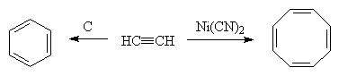 Ацетилен и его гомологи под действием высокой температуры (500 °С) и активированного угля претерпевают тримеризацию в производные бензола (реакция Бертло), тогда как при 60 °С в присутствии цианида никеля происходит тетрамеризация с образованием циклооктатетраена.