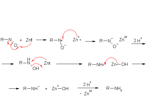 Восстановление нитроалканов обычно протекает весьма легко: можно применять довольно мягкие реагенты, например, металлы в кислой среде, соли олова(II), Na2S2O4 и т.д. Механизм этих реакций обычно рассматривают как последовательность актов одноэлектронного переноса от восстановителя к нитрогруппе и последующего присоединения протона.