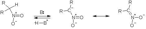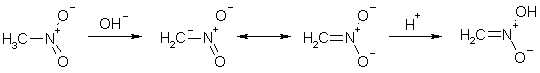 Как видно из величин pKa, нитроалканы депротонируются под действием гидроксид-аниона. Действительно, нитрометан (жидкое вещество тяжелее воды) растворяется в водной щелочи в результате превращения в аци-нитрометанат натрия, при подкислении этого раствора быстро происходит освобождение ацинитроформы, также растворимой в воде. Постепенный переход ацинитроформы в нитросоединение наблюдается по образованию нерастворимого в воде исходного соединения. Это явление называется десмотропией (сильно замедленной таутомерия).