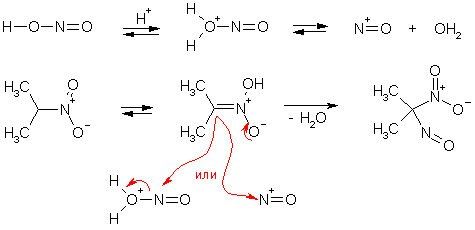 Способность образовывать ацинитроформу или анион придает нитроалканам свойства С-нуклеофилов средней силы. К превращениям ацинитроформы можно отнести реакцию нитрозирования. Первичные нитроалканы превращаются в нитроловые кислоты, вторичные – в псевдонитролы.