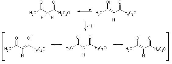 Ацетоуксусный эфир – пример соединения с ощутимым содержанием енольной формы (7% для чистого вещества). Стабилизация его енольной формы обусловлена теми же факторами, что и для β-дикетонов, но в данном случае они действуют менее эффективно, поэтому содержание енола невысоко (содержание енольной формы в ацетилацетоне, например, достигает 80%).