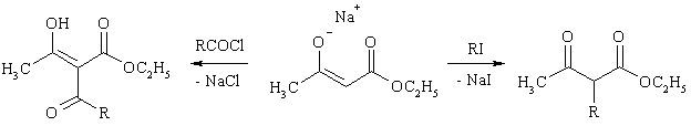 Анион ацетоуксусного эфира проявляет свойства сильного нуклеофила и весьма легко взаимодействует с алкилирующими и ацилирующими реагентами.