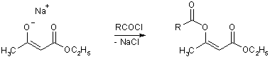 Соли ацетоуксусного эфира относятся к так называемым амбидентным нуклеофилам: в зависимости от условий реакция ацилирования может протекать как по атому углерода, так и по карбонильному кислороду. Атом кислорода сложноэфирной группы практически никогда не затрагивается, т.к. на нем локализован меньший отрицательный заряд. Соотношение продуктов С- и О-ацилирования зависит от характера растворителя: в полярных протонных растворителях (спирт) реакция идет преимущественно по атому углерода, а полярных апротонных (ацетон, диметилформамид, диметилсульфоксид) увеличивается выход продуктов ацилирования по атому кислорода.