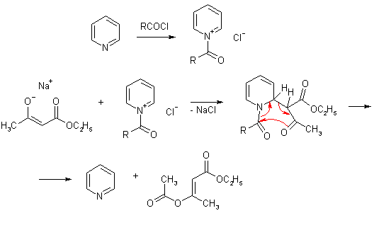 Кроме того, особенной склонностью к реакции по кислороду обладают тетраалкиламмониевые соли ацетоуксусного эфира, объемный катион которых . не способен координироваться с атомом кислорода и блокировать его нуклеофильные свойства. Синтез О-ациленолов ацетоуксусного эфира нередко проводят в пиридине, где ацилирующим реагентом является N-ацилпиридиниевая соль. Реакция протекает через промежуточное образование аддукта по α-положению гетероцикла.