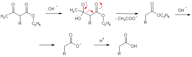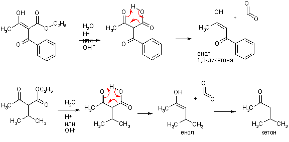 Кетонное расщепление замещенных ацетоуксусных эфиров позволяет синтезировать кетоны и дикетоны сложного строения в зависимости от природы заместителя: из алкилированных производных получают кетоны, а из ацилированных – дикетоны. Реакция включает в себя стадию декарбоксилирования β-кетокислот, образующихся при гидролизе кетоэфиров и проводится путем нагревания замещенного ацетоуксусного эфира в разбавленных кислоте или щелочи.