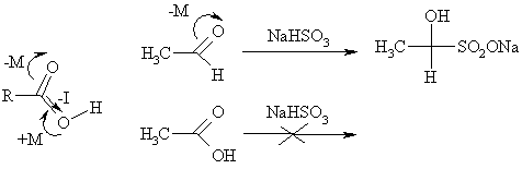 В молекулах карбоновых кислот возможно замещение гидроксильной группы, что используется для получения различных функциональных производных. Превращение протекает при действии нуклеофилов. Однако, большинство сильных нуклеофилов являются основаниями, поэтому они в первую очередь депротонируют карбоксильную группу, т.е. превращают кислоту в анион. В карбоксилат-ионе атом углерода не обладает необходимым дефицитом электронной плотности, и реакция останавливается. Применение более слабых нуклеофилов также не приводит к положительным результатам, так как электрофильность карбоксильного углерода кислоты меньше, чем в оксосоединениях, т.к. она погашается +М-эффектом гидросильного кислорода. К примеру, слабый нуклеофил – гидросульфит натрия – к карбоксильной группе не присоединяется.