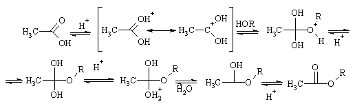 Поэтому для нуклеофильного замещения гидроксильной группы (реакции ацилирования) подбирают специальные условия. Так, реакцию кислот со спиртами для получения сложных эфиров (этерификация кислот) проводят в присутствии серной кислоты или газообразного хлороводорода, которые выполняют роль катализаторов. Катализ заключается в протонировании карбонильного атома кислорода на первой стадии, что повышает эффективный положительный заряд на углероде и облегчает атаку нуклеофила. На одной из последующих стадий происходит протонирование уже гидроксила и превращение его в хорошую уходящую группу – молекулу H2O.