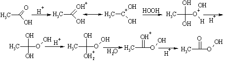 По аналогичному механизму протекает взаимодействие карбоновых кислот с пероксидом водорода в кислой среде. В результате этой реакции получаются так называемые надкислоты, имеющие важное значение для органического синтеза: они используются в качестве источников свободных радикалов и окислителей.
