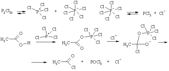 В рассмотренных примерах гидроксил путем протонирования превращается в хорошую уходящую группу – молекулу воды, а на первой стадии имеет место активация электрофильного центра кислотой. Аналогично, ацилирование катализируется кислотами Льюиса. Так, при действии на кислоты пентахлорида фосфора или тионилхлорида происходит замещение гидроксильной группы хлором и образуются хлорангидриды кислот. В ходе превращения протон замещается на сильный акцептор электронов, превращающий гидроксил в хорошую уходящую группу.