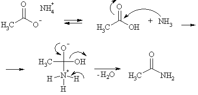 Гидроксил не удается заместить аминогруппой при действии аммиака или аминов на кислоту в мягких условиях. Указанные реагенты являются более сильными основаниями, чем карбонильная группа. Поэтому катализ кислотами, как в реакции этерификации, или замена протона сильным электроноакцептором, как при образовании ацилгалогенидов и ангидридов, в этом случае невозможны. Аммиак и амины образуют соли с карбоновыми кислотами, а карбоксилат-ион электрофилом не является. Тем не менее, при высокой температуре карбоксилаты аммония превращаются в амиды. Это объясняется тем, что соль диссоциирует при нагревании на кислоту и аммиак (амин), который как нуклеофил атакует карбоксильный атом углерода, но процесс этот требует жестких условий.