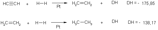 Из приведенных энергетических параметров легко видеть, что образующийся в результате присоединения электрофила к алкину винильный карбокатион более богат энергией (менее стабилен, труднее образуется), чем алкильный катион, возникающий при атаке электрофильной частицы молекулы алкена потому что алкилиденовая группа является более слабым донором, чем алкильная.