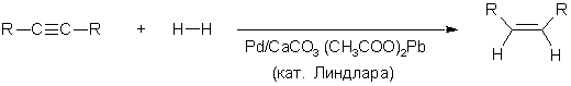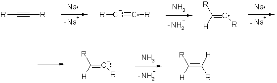 Как и при каталитическом восстановлении соединений с двойной связью, при гидрировании ацетиленов всегда наблюдается син-присоединение. транс-Алкены образуются в результате восстановления алкинов раствором натрия или лития в жидком аммиаке (до превращения металла в амид).