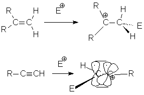 Другой способ объяснения заключается в том, что sp-гибридный С-атом со значительно большим трудом отдает электрофилу пару электронов, чем С-атом в состоянии sp2, поскольку вклад s-характера его орбиталей составляет 50%, а не 33%, т.е. электроны лежат ближе к ядру (см. выше энергии ВЗМО).