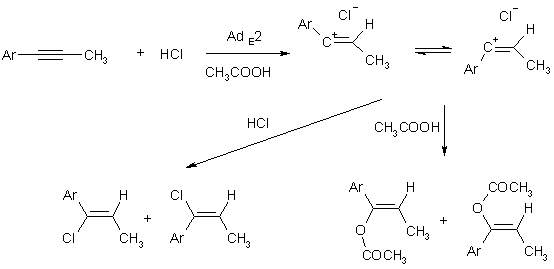 Для описания реакций электрофильного присоединения к алкинам применяют два механизма – би- и тримолекулярный (AdE2 и AdE3).