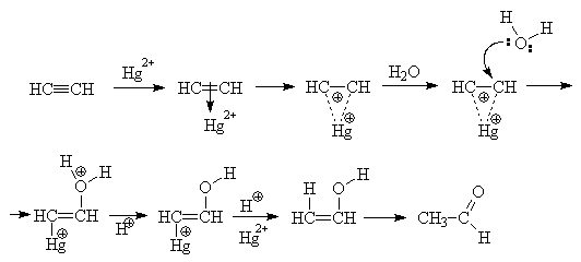 Присоединение воды к алкинам в присутствии кислот и солей ртути(II) называют реакцией Кучерова. С помощью этого превращения из ацетилена получают ацетальдегид, который может быть окислен до уксусной кислоты. Из замещенных алкинов в этих условиях образуются кетоны (правило Марковникова)