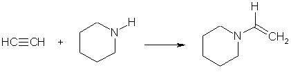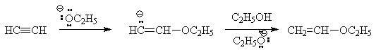 Данная реакция, как и присоединение воды, облегчается в присутствии катионов ртути. Последние катализируют также присоединение к ацетиленам других нуклеофилов, например, спиртов, что приводит к алкилвиниловым эфирам.