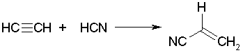 Реакция винилирования демонстрирует электрофильный характер sp-гибридного атома углерода. Важное промышленное значение имеет присоединение HCN приводящее к ценному полупродукту – акрилонитрилу.