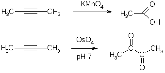Ацетилены окисляются действием перманганата калия в щелочной среде по месту разрыва тройной связи до карбоновых кислот, в более мягких условиях (OsO4, нейтральная среда) реакция останавливается на стадии образования 1,2-дикарбонильных соединений.